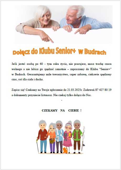 Jeśli jesteś osobą po 60-tym roku życia, nie pracujesz, masz trochę czasu wolnego, a nie lubisz go spędzać samotnie – zapraszamy do Klubu “Senior+” w Budrach. Gwarantujemy miłe towarzystwo, super zabawę, ciekawie spędzony czas, coś dla ciała i ducha.