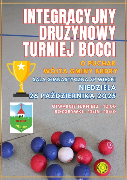 Wójt Gminy Budry – Pan Mariusz Molda oraz Kierownik Gminnego Ośrodka Pomocy Społecznej w Budrach – Pani Aldona Łyczewska – zapraszają do uczestnictwa w Integracyjnym Turnieju Bocci o Puchar Wójta Gminy Budry, który odbędzie się w dniu 26 października 2025 r. o godzinie 12:00 w Sali Gimnastycznej Zespołu Szkolno-Przedszkolnego w Więckach.