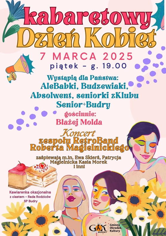 Kabaretowy Dzień Kobiet – już w najbliższy piątek 7 marca 2025 r. o godzinie 19:00 w Gminnym Ośrodku Kultury w  Budrach.