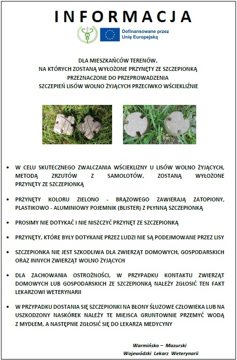 Przynęty zawierające blister ze szczepionką zostaną zrzucone z samolotów na obszary bytowania zwierząt dzikich (obszary leśne, pola, łąki).