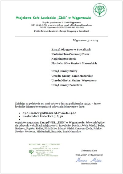 Działając na podstawie art. 42ab ustawy z dnia 13 października 1995 r. – Prawo łowieckie informuję o organizacji polowania zbiorowego w dniu: